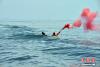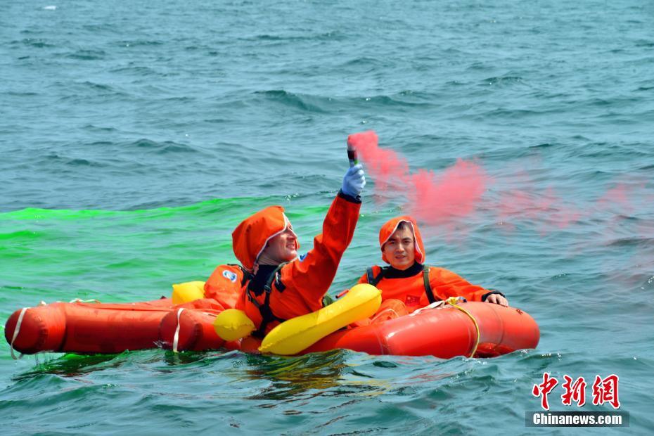 16名中國航天員和2名歐洲航天員,8月21日在山東省煙臺市附近海域圓滿完成了為期17天的海上救生訓練任務。圖為訓練期間,8月8日,參加訓練的航天員在水上使用光煙信號管。 中新社發(fā) 朱九通 攝 -