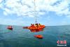 16名中國航天員和2名歐洲航天員,8月21日在山東省煙臺市附近海域圓滿完成了為期17天的海上救生訓練任務。圖為訓練期間,8月2日,甲板上的機械吊臂把救生吊籃起吊入水。 中新社發(fā) 朱九通 攝