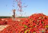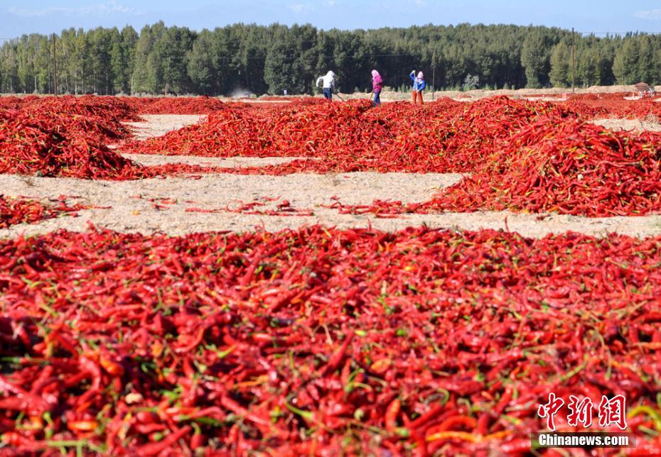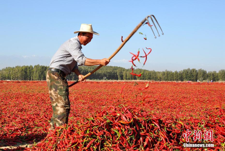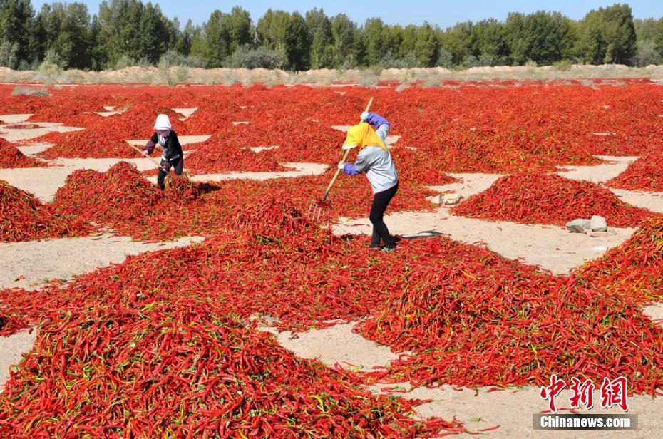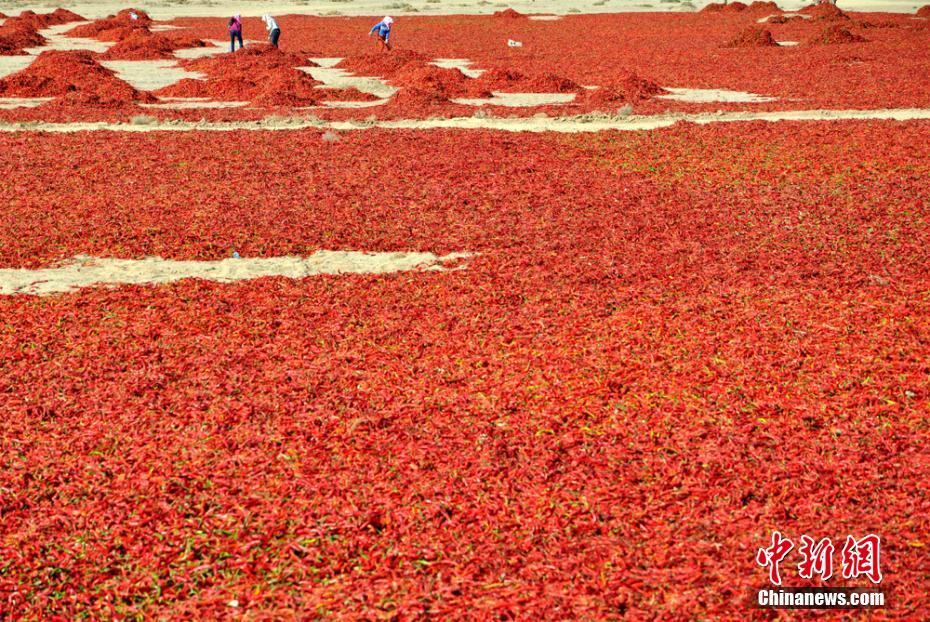 •    農(nóng)民在晾曬辣椒。張淵 攝