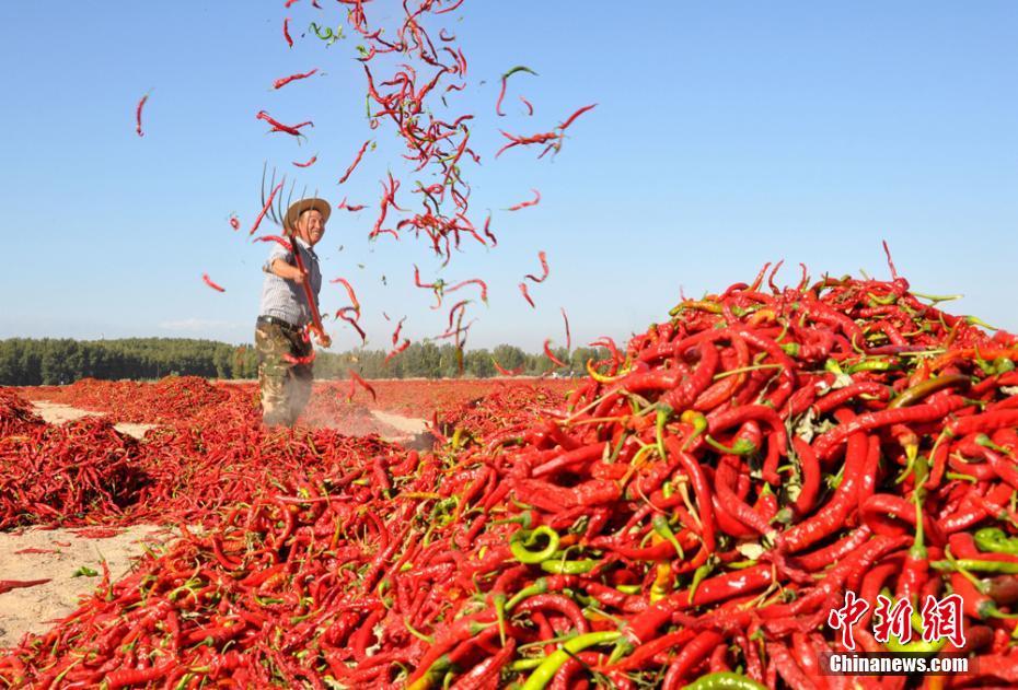 •    9月20日,甘肅張掖市高臺縣合黎鎮(zhèn)八壩村村民在晾曬辣椒。高臺縣地處河西走廊中部,由于光照充足,沙性土壤等自然條件,產(chǎn)出的辣椒口感佳、天然色素高。時下,該縣種植的9689畝辣椒迎來豐收季,年產(chǎn)鮮紅辣椒約2萬噸,帶動當(dāng)?shù)剞r(nóng)民實現(xiàn)增收。張淵 攝
