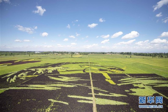 這是8月18日在新疆察布查爾錫伯自治縣納達(dá)齊牛錄鄉(xiāng)稻田畫基地拍攝的稻田畫。近日,新疆察布查爾錫伯自治縣納達(dá)齊牛錄鄉(xiāng)稻田畫基地進(jìn)入最佳觀賞期,迎來大批游客觀看。新華社記者 沙達(dá)提 攝