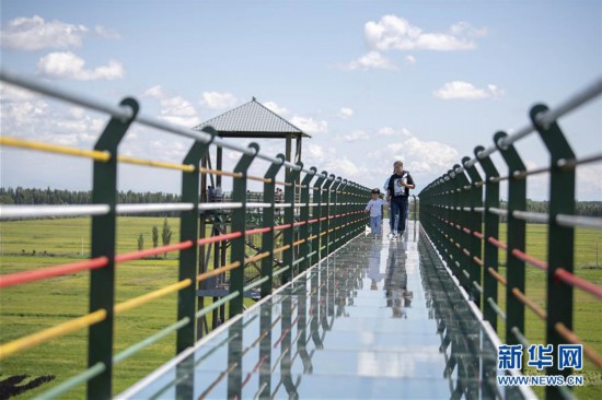 8月18日,游客在新疆察布查爾錫伯自治縣納達(dá)齊牛錄鄉(xiāng)稻田畫基地的玻璃棧道上賞景。近日,新疆察布查爾錫伯自治縣納達(dá)齊牛錄鄉(xiāng)稻田畫基地進(jìn)入最佳觀賞期,迎來大批游客觀看。新華社記者 沙達(dá)提 攝 -