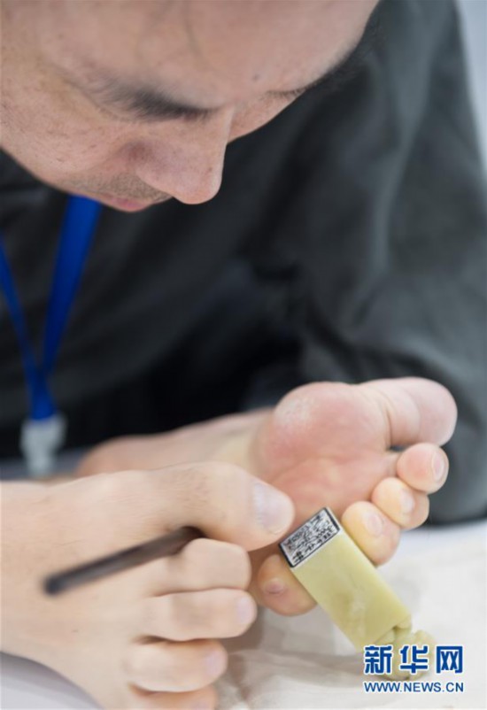10月27日,一名殘疾人藝術家在展能節(jié)上用雙腳進行篆刻。 當日,第六屆全國殘疾人職業(yè)技能大賽暨第三屆全國殘疾人展能節(jié)在浙江嘉興開幕。 新華社記者翁忻旸攝 -