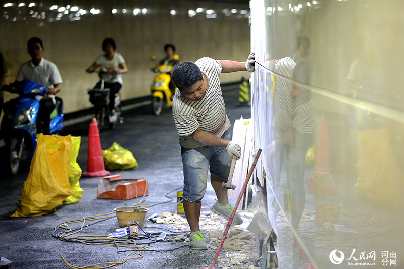 央廣網(wǎng)河南分網(wǎng)消息 “今天干到夜里12點也得把它修完,領(lǐng)導(dǎo)下任務(wù)了!9月21日晚18點左右,在河南鄭州福元路非機動車道自西向東方向下穿隧道里,一位手拿鐵錘砸墻的施工人員告訴記者。