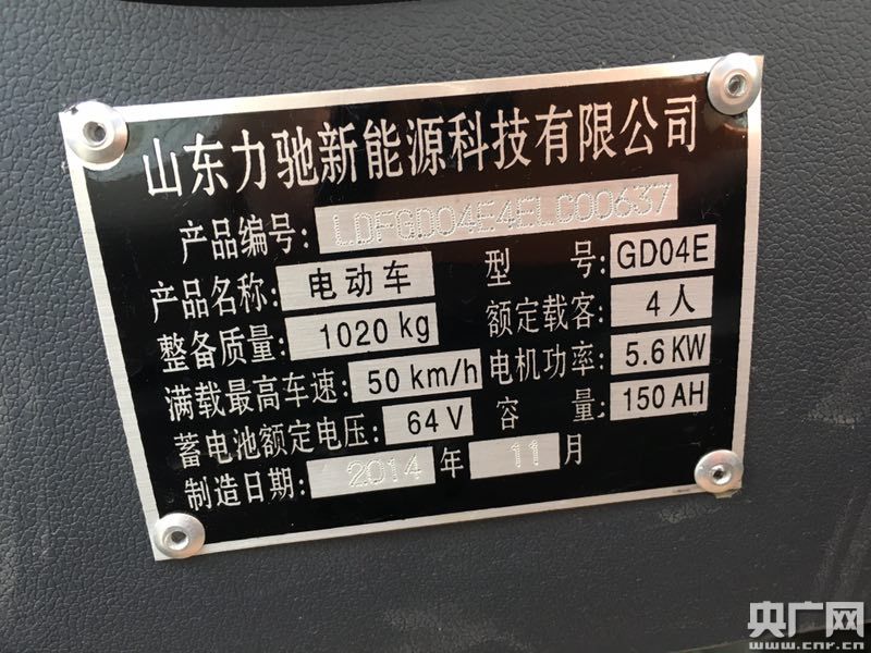 據(jù)民警檢查,該車的銘牌上只是標(biāo)明該車是“電動(dòng)車”,沒有說是電動(dòng)汽車,但是可以荷載4人,滿載最高時(shí)速可達(dá)到50公里/小時(shí)。