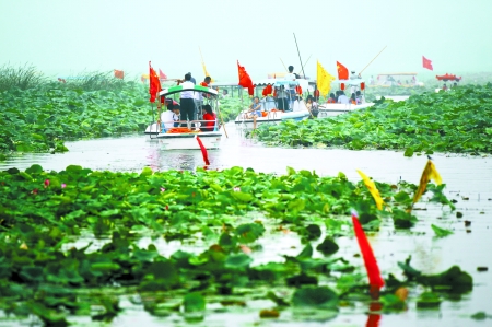中廣網(wǎng)河南分網(wǎng)消息 據(jù)河南日報(bào)報(bào)道: 8月6日,淮陽縣龍湖萬畝荷塘里姹紫嫣紅的荷花吸引著來自全國各地的游客。在煙雨朦朧中,蕩著雙槳手把船篙的船夫和游客歡快的笑聲洋溢在湖面上。