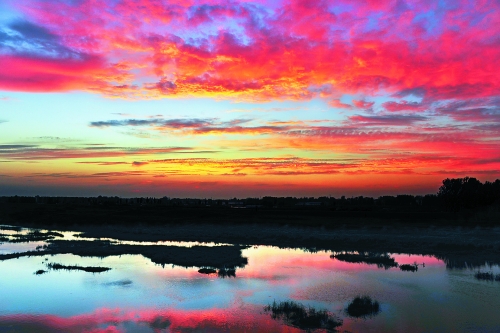 朝陽(yáng)照耀中的黃河濕地景色美不勝收。