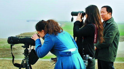 濕地保護(hù)人員和媒體記者共同關(guān)注候鳥(niǎo)遷徙情況。