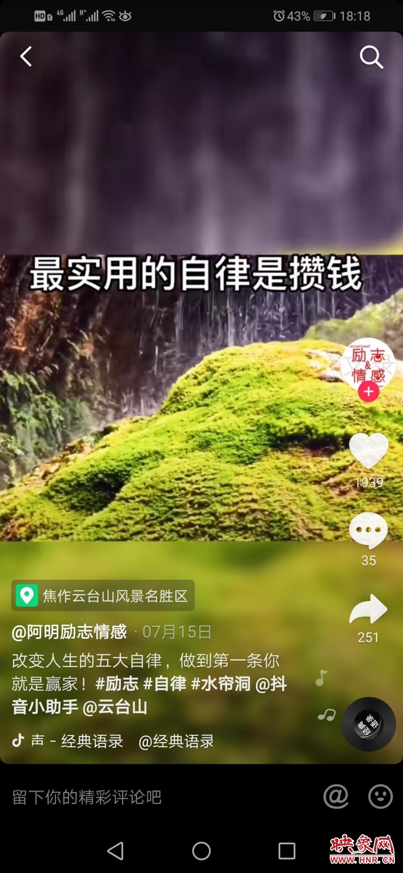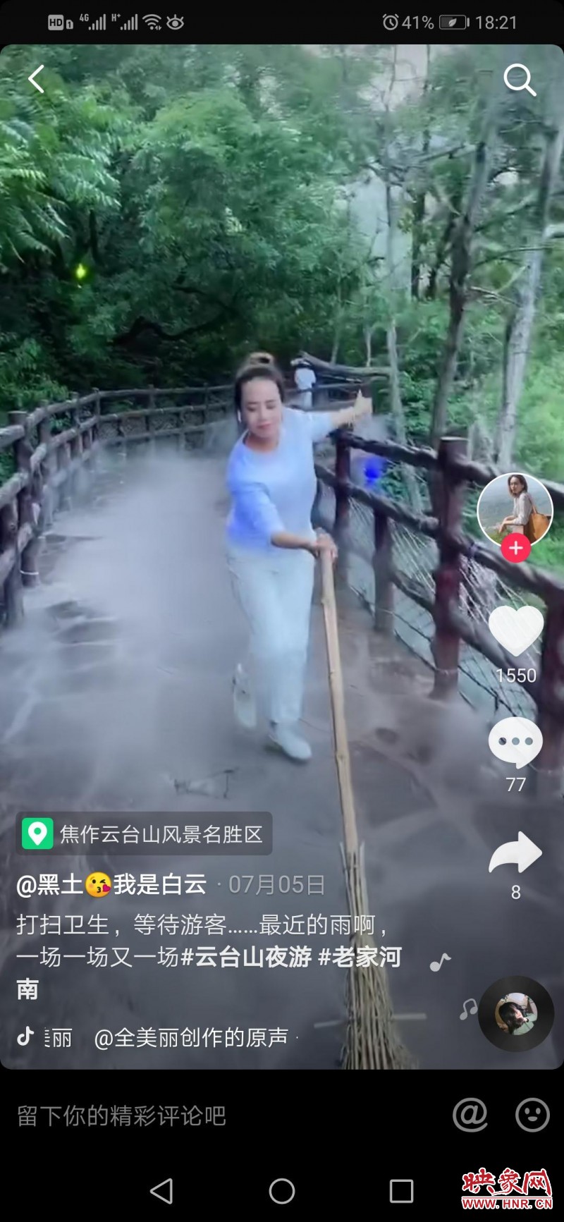 “有一次刷抖音,看到一個小姐姐在大山里配合音樂唱歌,感覺到是那么美,我就模仿這個視頻拍了一個抖音,當(dāng)時的燈光、天氣特別美,發(fā)出來以后一下就火了!惫自普f,“我工作的云臺山特別美,我就開始把歌曲和美景結(jié)合起來,推出一系列短視頻!