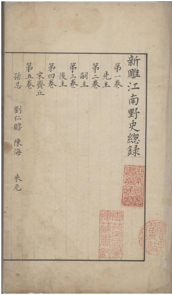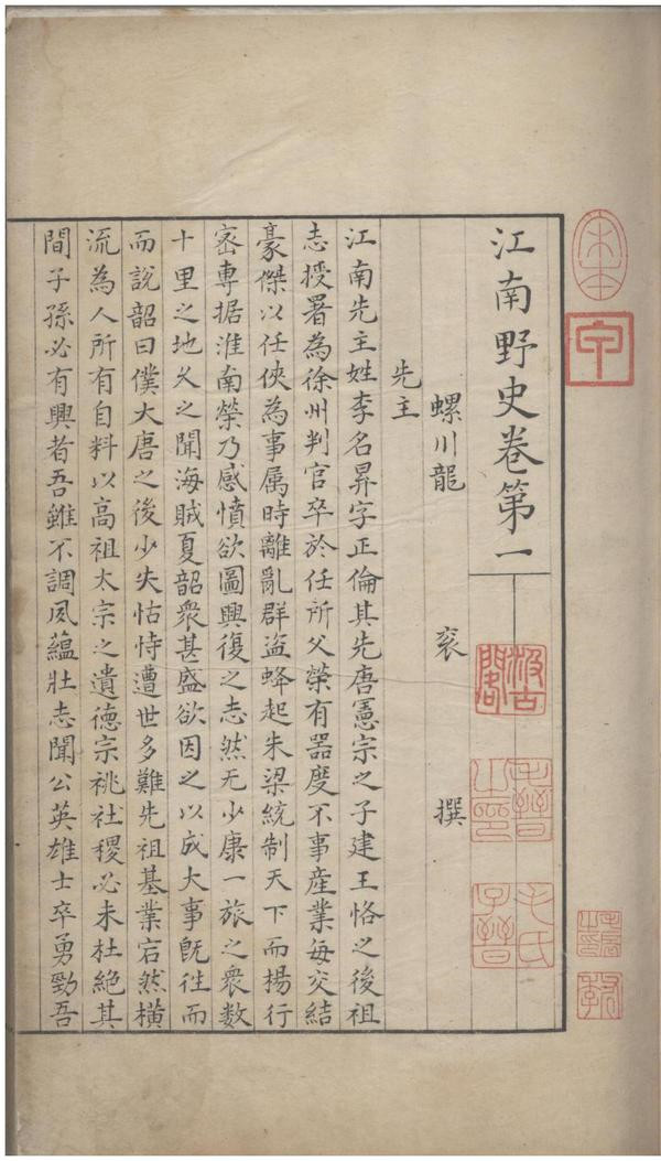 河南省圖書館館藏《江南野史》十卷,宋龍袞撰,明末毛氏汲古閣抄本,1函2冊,入選第六批國家珍貴古籍名錄(編號12509 )。此書系記錄南唐至宋初江南史事的紀(jì)傳體史書,首三卷分載南唐三主事跡,后七卷皆為南唐諸臣傳,凡三十四傳。是書鈐有“明黃翼收藏”“毛晉之印”“汲古閣”“宋本”“甲”“毛扆之印”“雪苑宋氏蘭揮藏書記”等印,表明其曾先后為明清藏書家黃翼圣、毛晉、毛扆、宋筠等所收藏。該書已入選《中國古籍善本書目》史部2400號,據(jù)原文化部頒發(fā)的《古籍定級標(biāo)準(zhǔn)》定為二級古籍。