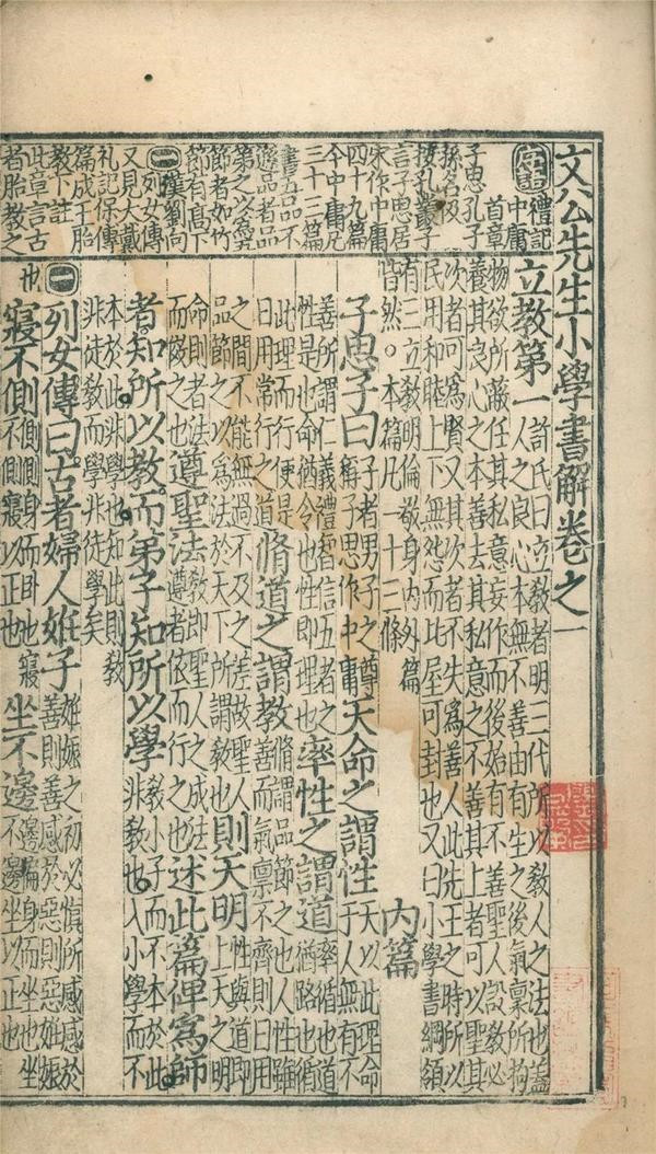 河南省圖書館館藏《文公先生小學(xué)書解》宋朱熹撰,明前期刻本,一函四冊,入選第六批國家珍貴古籍名錄(編號12625 )。小學(xué)題辭,番陽饒氏分為十節(jié)。今依石洞紀(jì)聞逐節(jié)標(biāo)題如左,其解說附下方。饒魯(1193—1264)字伯輿,又字仲元,人稱雙峰先生,南宋大教育家,理學(xué)大家。曾師從朱熹高足、女婿黃干,極得器重。后赴試不第,遂專意經(jīng)學(xué)。是書分為:內(nèi)(立教、明倫、敬身、稽古)、外(嘉言、善行)兩篇六個方面。此書刻風(fēng)類似元代風(fēng)格,應(yīng)不晚于明早期!吨袊偶票緯俊纷硬00536,《中國古籍總目》子1-2651兩種書目僅有河南省圖書館一家收藏有此書。據(jù)原文化部頒發(fā)的《古籍定級標(biāo)準(zhǔn)》,定為二級古籍。因其獨有的文獻(xiàn)價值,被《元明刻本朱子著述集成》收錄,由華東師范大學(xué)出版社高仿印制出版。