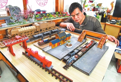 站臺、站房、天橋、鐵軌、蒸汽機車、電力機車、貨運列車、龍門吊……11月24日,走進洛陽車站貨運員孫玉明的家中,一件件逼真的鐵路模型擺在桌子和窗臺上,讓人仿佛進入了“鐵路王國”。為了給新學員做業(yè)務培訓,他用廢紙箱板、泡沫板、掉落的樹枝等材料,按比例做成模型給學員講解。8年以來,他已制作出百余件鐵路模型。