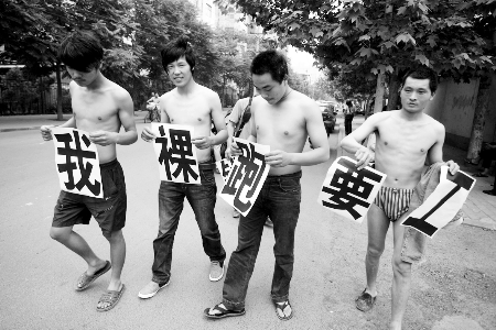 昨日下午4時(shí)許,鄭州北環(huán)與園田路附近,4名年輕男子突然解開扣子,脫掉上衣,膽大的脫得只剩一條內(nèi)褲。之后,幾人拿出準(zhǔn)備好的“廣告”:“我裸跑要工錢。”