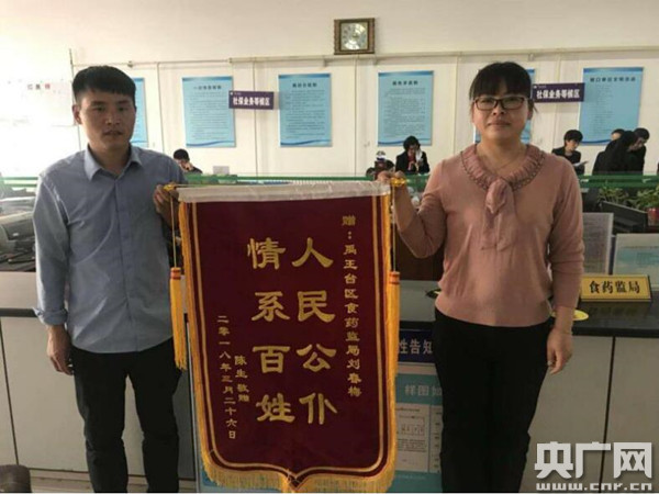 央廣網(wǎng)河南分網(wǎng)4月2日消息 (記者胡曉輝 通訊員韓吳琦)3月27日,禹王臺(tái)區(qū)某餐飲店的負(fù)責(zé)人陳先生專程來到禹王臺(tái)區(qū)行政服務(wù)大廳食藥監(jiān)局窗口,將一面寫著“人民公仆 情系百姓”的錦旗送到區(qū)食藥監(jiān)局窗口劉春梅的手中,表達(dá)他對(duì)食藥監(jiān)局服務(wù)窗口在為他辦理食品經(jīng)營許可過程中的一系列優(yōu)質(zhì)、高效、便捷服務(wù)的感謝。