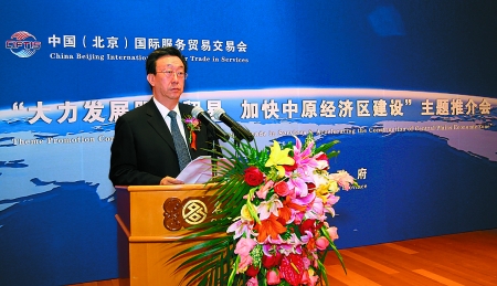 5月28日,“大力發(fā)展服務(wù)貿(mào)易 加快中原經(jīng)濟(jì)區(qū)建設(shè)”主題推介會(huì)在北京隆重舉行。省長(zhǎng)郭庚茂發(fā)表主題演講。記者 董亮 攝