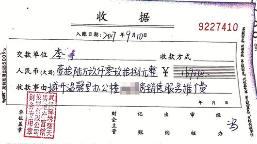 收據(jù)顯示,李女士所交的“推廣費(fèi)”是武漢錦繡楚天房地產(chǎn)營(yíng)銷策劃有限公司所收。記者聯(lián)系到該公司“陳總”,詢問(wèn)這筆錢該不該收!澳阏f(shuō)呢?”對(duì)方反問(wèn)記者,并說(shuō),“我很忙,不想多談,要想退錢,可以去打官司!