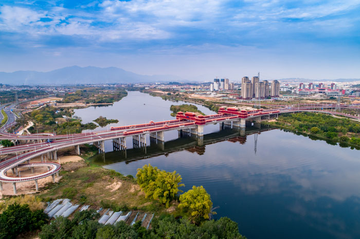 凌空俯瞰金峰大橋,紅色的廊亭、樓閣十分醒目的橫跨在九龍江西溪上。金峰大橋設(shè)計(jì)為景觀性大橋,主橋橋型采用“廊橋薌韻”方案,橋梁兩側(cè)人行道設(shè)置有長(zhǎng)廊和古亭,橫向設(shè)置兩座人行天橋,紅磚瓦、燕尾屋融入了閩南特色建筑元素。金峰大橋是漳州九龍江上第一座具有“閩南薌韻”廊橋和古亭標(biāo)志性的大橋,成為漳州一張最靚麗的名片。