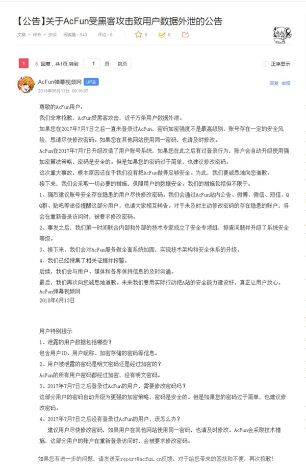 附:《關(guān)于AcFun受黑客攻擊致用戶數(shù)據(jù)外泄的公告》