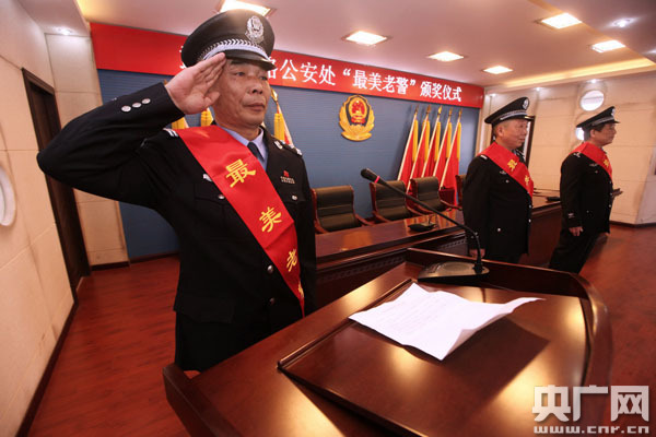 ”明天他們將褪去這身警服,這個不舍的敬禮他希望青年民警能很好的傳承下去“3月29日下午15時,武漢鐵路公安處隆重舉行春運(yùn)”最美老警“頒獎儀式,最美老警正在授獎