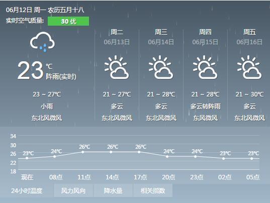具體預(yù)報:12日白天多云有陣雨,氣溫23℃—27℃,偏北風(fēng)2—3級;12日晚到13日白天陣雨轉(zhuǎn)多云,氣溫23℃—28℃,偏北風(fēng)2—3級;13日晚到14日白天多云,氣溫21℃—28℃,偏北風(fēng)2—3級。
