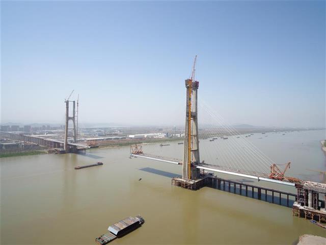 據(jù)介紹,安九鐵路鳊魚洲長江大橋2017年10月開工建設(shè),預(yù)計(jì)年內(nèi)大橋主體工程完工。大橋北側(cè)位于湖北黃梅縣,南側(cè)位于江西九江市。大橋?yàn)樗木鐵路大橋,其中兩線為高鐵線,時(shí)速350公里;預(yù)留兩線為客貨線,時(shí)速200公里。鳊魚洲長江大橋?yàn)橹骺?72米、全長1320米的雙塔雙索面交叉索斜拉橋,是國內(nèi)首座交叉索斜拉橋。