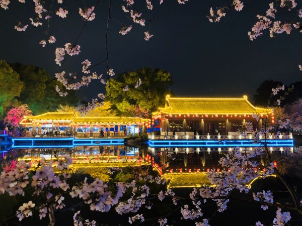 “白天賞櫻花本身,夜間賞櫻花園意境!卑頃r(shí)分,暮色將櫻園籠罩,園內(nèi)彩燈盡數(shù)亮起,423畝東湖櫻花園被瞬間點(diǎn)亮。白天內(nèi)斂典雅的曲院櫻艷張揚(yáng)了起來,飛檐上掛著紅彤彤的燈籠,與極具古風(fēng)的仙鶴畫舫交相輝映;五重塔靜靜矗立,描金勾勒出東湖櫻花園最亮眼的部分;花溪流水潺潺,倒映出五彩斑斕的燈影,如夢(mèng)如幻。