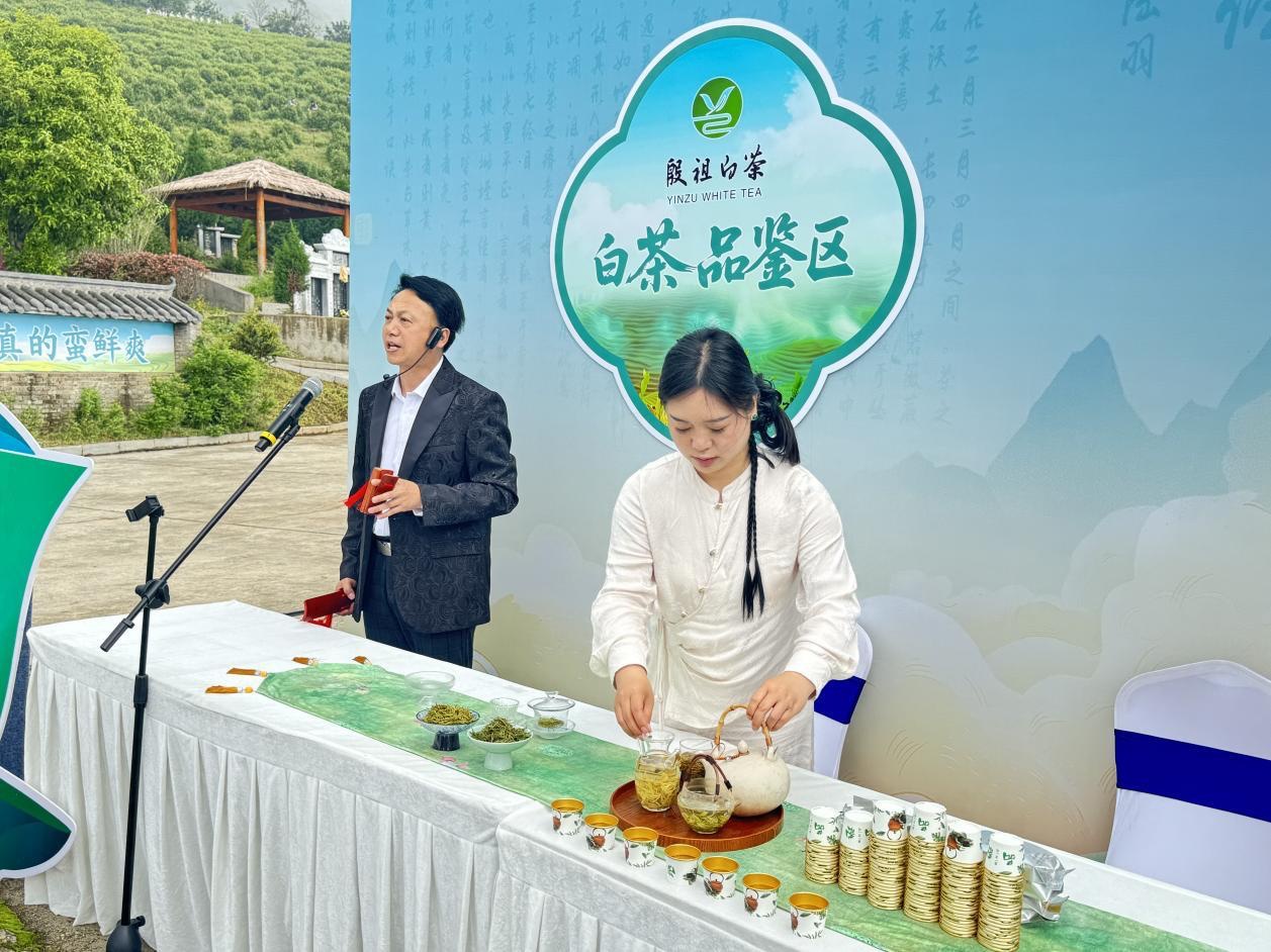 發(fā)布會現(xiàn)場,專設(shè)的白茶品鑒區(qū)前圍滿了游客和當?shù)夭柁r(nóng)。玻璃杯中,殷祖白茶形似鳳羽,芽葉玉白、莖脈翠綠,湯色清亮,茶香裊裊,沁人心脾。