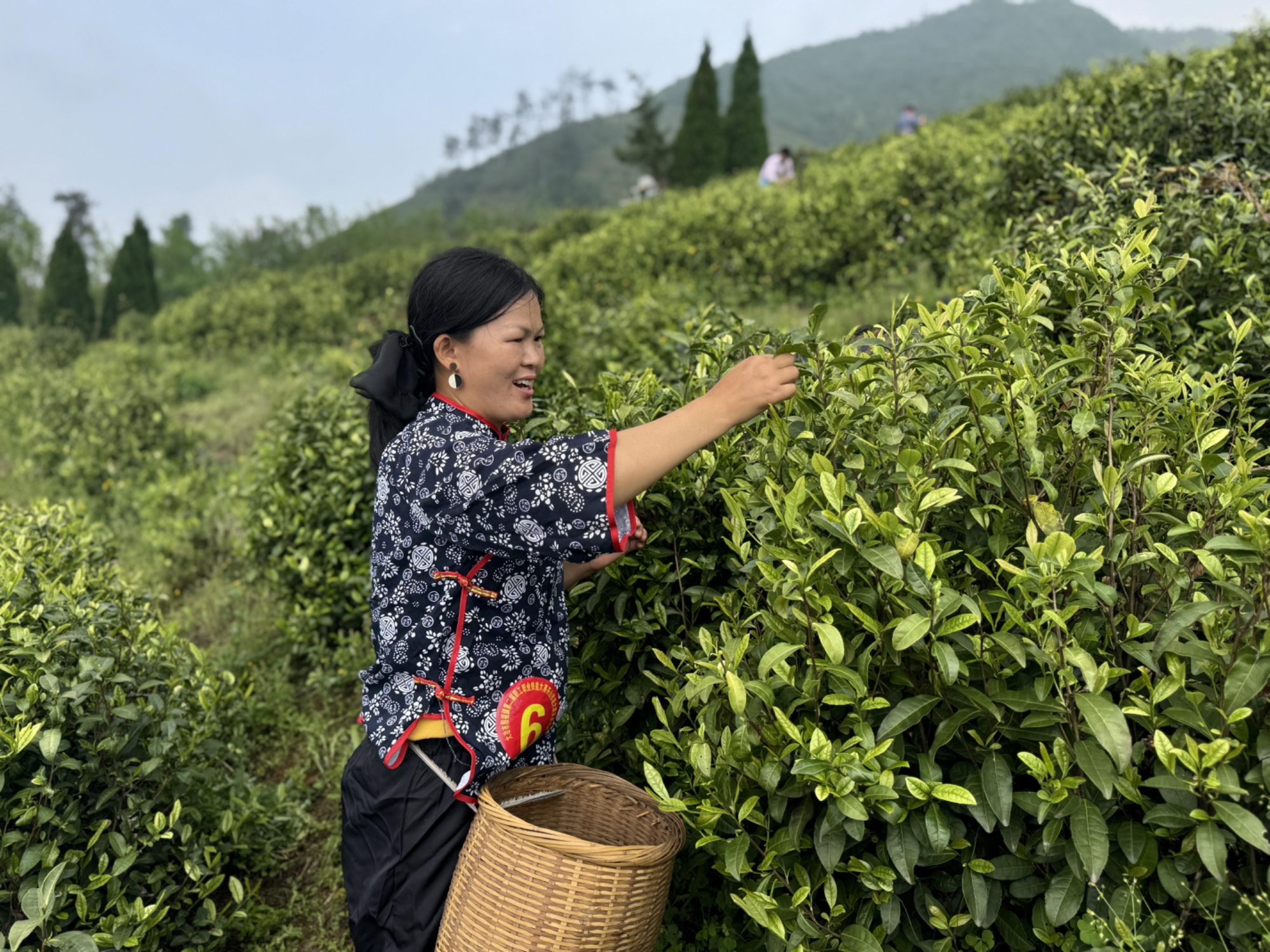 茶園深處,十幾名身著藍布碎花衣的采茶女正巧手翻飛,一芽一葉落入竹簍,成為鏡頭追逐的焦點。她們指尖輕捻,動作嫻熟,一捏一提間,鮮嫩的茶芽便穩(wěn)穩(wěn)落入簍中。蜿蜒的茶壟間,幾位漢服愛好者手持團扇,漫步打卡,衣袂與茶香共舞,裙裾隨風(fēng)輕揚,仿佛從古畫中走出的采茶仕女。