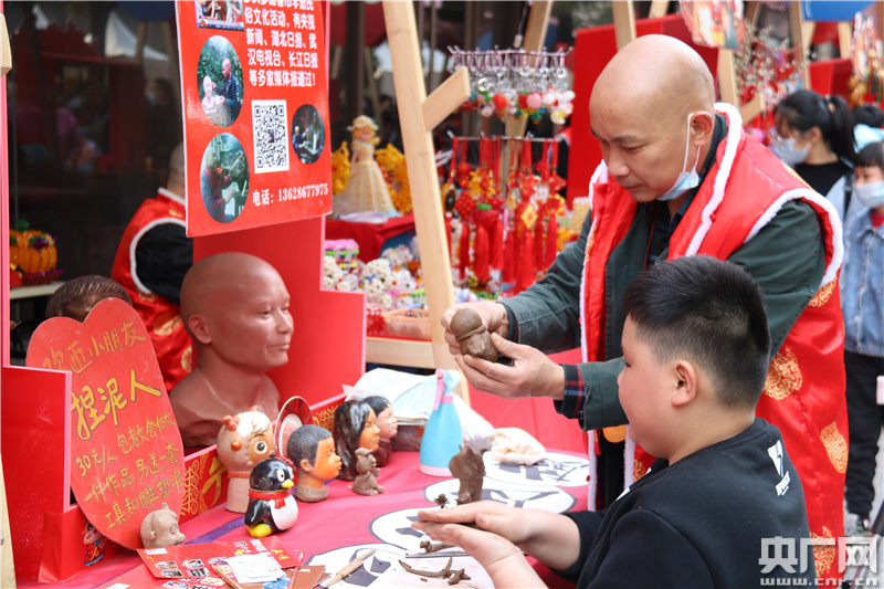 非遺市集添濃年味。主舞臺對面是由30余組花車組成的非遺市集。非遺市集格外紅火喜慶,精美的剪紙作品,憨態(tài)可掬的泥塑,漢繡、漢派石雕、魯班鎖、布藝堆繡、燈籠等工藝作品應(yīng)有盡有,還有小朋友最愛的糖畫。