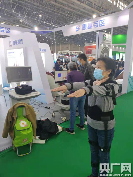 在位于醫(yī)療器械展館的智能化康復(fù)訓(xùn)練器械體驗(yàn)區(qū),家住武漢硚口區(qū)的王阿姨正在體驗(yàn)三維步態(tài)評(píng)估儀,只見她身穿感應(yīng)裝置做出各種動(dòng)作,位于左側(cè)的顯示屏上一個(gè)數(shù)據(jù)小人正隨她的動(dòng)作改變形態(tài)!斑@是我們公司最新研發(fā)的三維步態(tài)評(píng)估儀,使用者只需簡(jiǎn)單穿戴數(shù)據(jù)傳輸裝置并做出動(dòng)作,智能計(jì)算機(jī)便可根據(jù)其動(dòng)作幅度判斷受評(píng)者關(guān)節(jié)部位是否發(fā)生病變!痹撊S步態(tài)評(píng)估儀生產(chǎn)商說(shuō)。