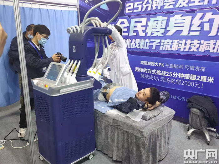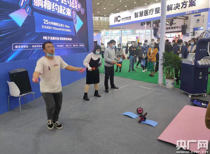 “加油跳,跳滿25分鐘,只要沒有像他們說(shuō)的減脂成功,我們就能得到獎(jiǎng)勵(lì)”在該展館的醫(yī)普茂展區(qū),一名參與“全民瘦身約戰(zhàn)”的女孩對(duì)同伴喊道;顒(dòng)現(xiàn)場(chǎng),不少參觀者踴躍參加25分鐘減圍挑戰(zhàn),但在經(jīng)過(guò)約十分鐘的跳繩與搖健身環(huán)后均“敗下陣來(lái)”。隨后,該參展商向大家介紹了核心“黑科技”——粒子流轟脂科技,并邀請(qǐng)參展人群進(jìn)行體驗(yàn)。