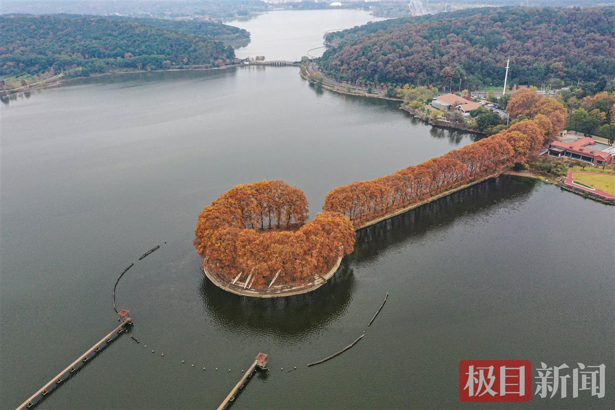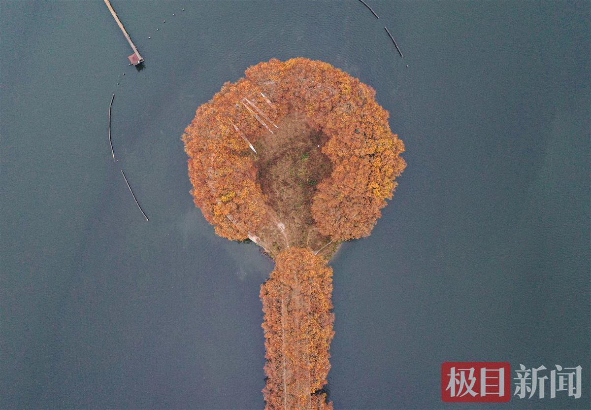 11月20日,極目新聞記者在武漢市東湖南山驛站附近看到,一條橙黃色的法國梧桐,仿佛一個驚嘆號伸入湖中,美不勝收。O目新聞記者 王永勝 攝)