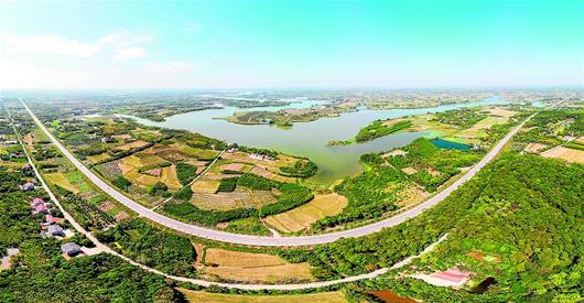9月 23日,從高空俯視,荊(州)當(dāng)(陽)旅游公路在青山綠水中蜿蜒。該道 路 全 長(zhǎng)50.7公里,是連接宜昌和荊門兩市的一條快速通道,極具景色之美、風(fēng)物之魅和人文之韻。目前一期工程建設(shè)的26.7公里路段已建成通車。