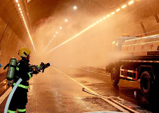 11月16日,省交通運輸廳在鄂西高速“荊楚第一隧”——金龍隧道舉行反恐綜合應急演練。上午9時,1名“恐怖分子”駕車至金龍隧道入口處縱火,鄂西管理處、路政、高警、公安、消防、長陽縣政府安全應急辦等多部門聯(lián)勤聯(lián)動,成功處置了應急“險情”。圖為隧道內,消防員對事故車輛進行滅火作業(yè)。(視界網(wǎng) 何祝青 攝)