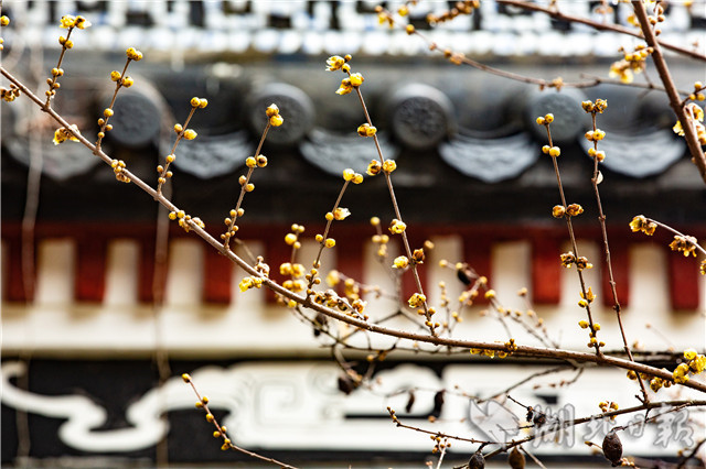 12月26日,在湖北秭歸屈原故里景區(qū)屈原祠內(nèi)拍攝的蠟梅。寒冬時(shí)節(jié),蠟梅盛放,花似蜜蠟,馨香肺腑,形成一道冬日溫情風(fēng)景線。(視界網(wǎng)王罡攝)