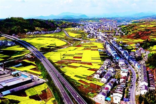 4月9日,竹山縣麻家渡鎮(zhèn)營(yíng)盤(pán)河村,盛開(kāi)的油菜花與谷竹高速公路、346國(guó)道組成一派和諧的田園風(fēng)光。近年來(lái),竹山縣堅(jiān)持把交通基礎(chǔ)設(shè)施建設(shè)作為鄉(xiāng)村振興的先導(dǎo)性工作來(lái)抓,安全便捷的公路網(wǎng)串起山河林地,連接城鎮(zhèn)鄉(xiāng)村,改善了農(nóng)村出行條件,為農(nóng)民奔小康提供了保障。 (視界網(wǎng) 章磊 攝)