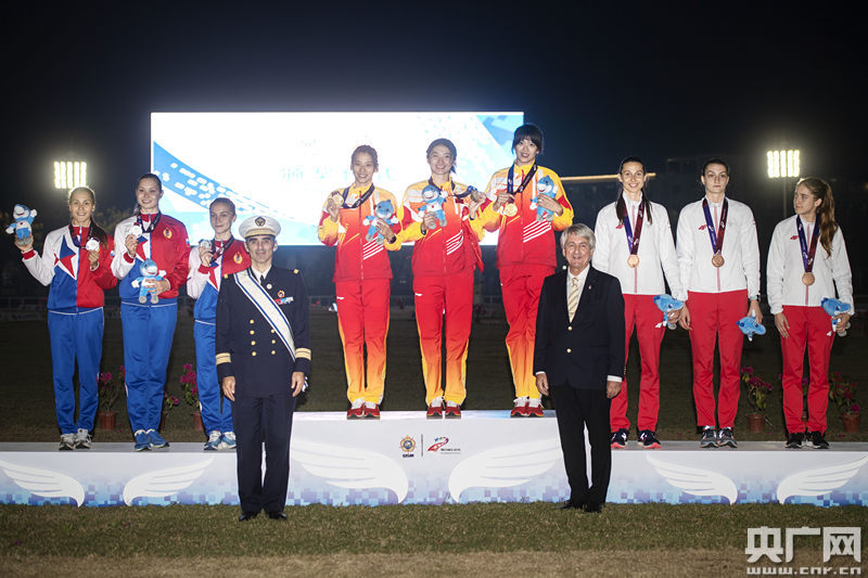 圖為軍運(yùn)會(huì)現(xiàn)代五項(xiàng)女子團(tuán)體賽頒獎(jiǎng)儀式 央廣網(wǎng)記者黃炎秋 攝