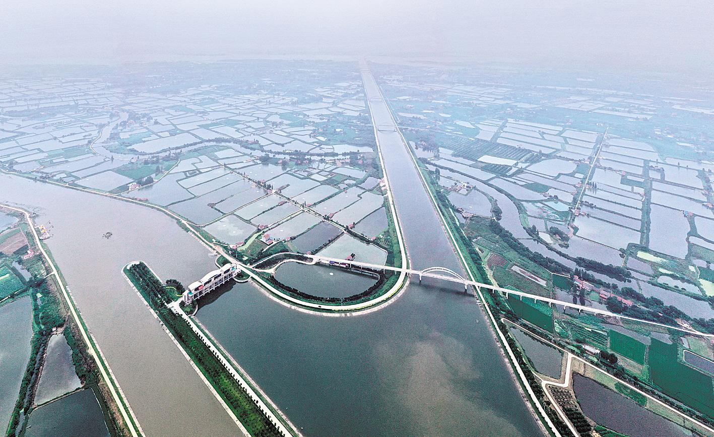 7月14日,為減輕長(zhǎng)湖防汛壓力,引江濟(jì)漢工程開始為長(zhǎng)湖撇洪。圖中河道,左為連接長(zhǎng)湖的拾橋河道,右為引江濟(jì)漢主干渠。 (湖北日?qǐng)?bào)全媒記者 劉曙松 通訊員 黃志剛 攝)