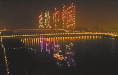 夜空中,千架無人機(jī)編隊組成“致敬巾幗、節(jié)日快樂”字樣。 記者許巍巍 攝