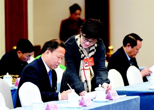 湖北日?qǐng)?bào)訊 圖為7日,劉雪榮代表(左)和楊俊代表(右)在長(zhǎng)江法的議案上進(jìn)行聯(lián)名。 (全媒體記者 張朋 攝)