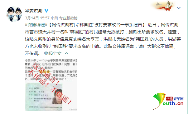 中國青年網(wǎng)3月15日北京電(見習(xí)記者 劉利影)3月14日下午,湖北省洪湖市公安局官方微博@平安洪湖 發(fā)布微博辟謠稱,網(wǎng)傳洪湖村民"韓國勝"被打要求改名一事系謠言。