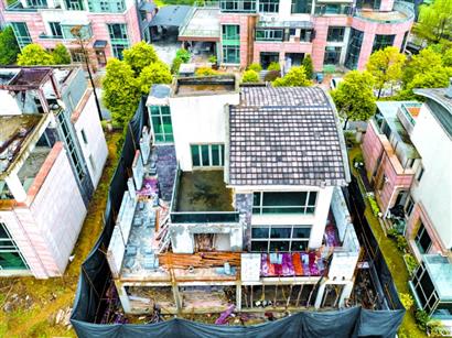 站在小區(qū)一棟小高層樓上,記者看到,灝區(qū)多棟別墅與旁邊尚未住人的別墅相比,頂層結構已經(jīng)發(fā)生變化。兩棟已經(jīng)打圍卻停止施工的別墅頂層,明顯可見還未澆筑的鋼筋骨架以及新砌的磚塊。