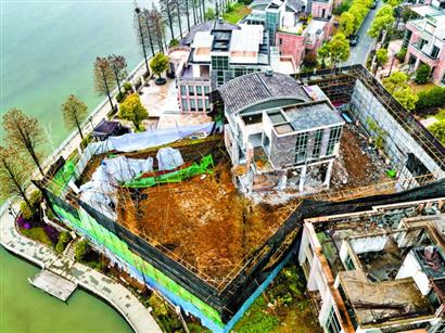 踩著湖邊的石墩子,記者爬到圍擋上看到,別墅猶如被拆遷過一樣,一樓、二樓多面墻壁都被拆除,僅剩下立柱,不僅如此,房后的院子已經(jīng)被挖開了一個面積數(shù)百平方米的大基坑,基坑邊緣直抵湖岸,有一層樓深,別墅的地基樁都露了出來,坑邊還散落著腳手架,院內(nèi)并無工人施工。