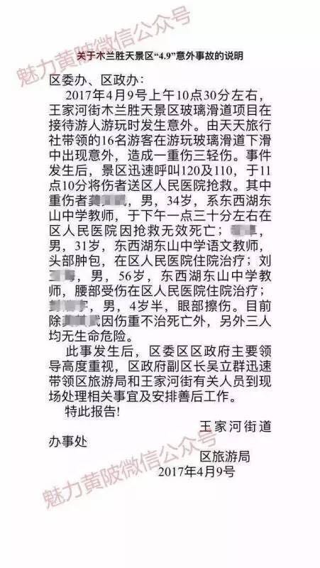 今天,一則木蘭勝天景區(qū)玻璃滑道上發(fā)生游客傷亡事故的消息,在網(wǎng)上迅速流傳。消息稱,9日上午10時(shí)30分許,武漢天天旅行社導(dǎo)游帶領(lǐng)的旅游團(tuán),在玻璃滑道上出事。其中一人死亡,3人受傷,均為武漢東西湖區(qū)東山中學(xué)老師和家屬。沒有搶救過來,去世的龔老師34歲。