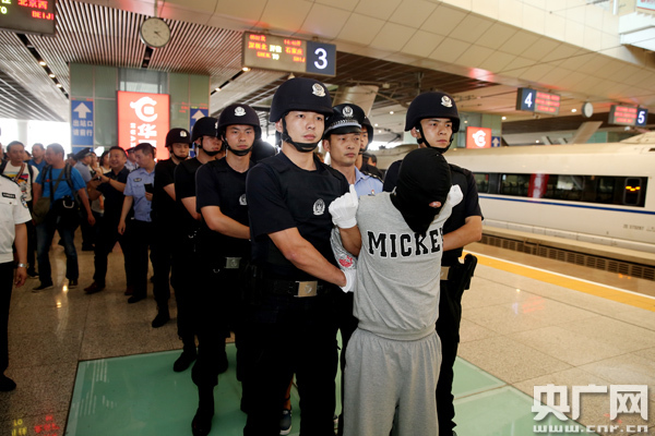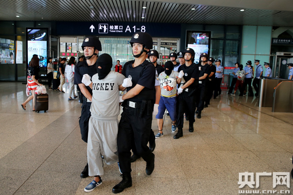 圖為:5月27日下午,從云南押解回漢的6名嫌疑人抵達武漢火車站(應后威攝)