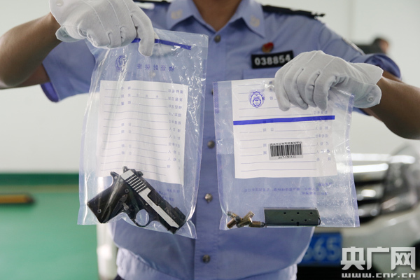 圖為:收繳涉案的西格紹爾手槍一只和子彈5發(fā)(應后威攝)