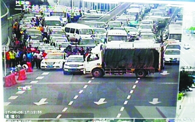 發(fā)生事故后,眼看無法逃離,氣急敗壞之下,陳某將整輛貨車橫在二環(huán)線上(如圖),不讓其他車輛行駛,二環(huán)線上車流量巨大,此舉造成二環(huán)線車流積壓,發(fā)生擁堵。此后,陳某打開車門準備棄車逃離。民警將其追上,并按在地上制服。3分鐘后,民警將肇事車輛開至安全位置停放,此時擁堵才逐漸緩解。