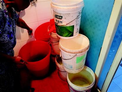 昨日上午,記者來(lái)到橋北路,在教師小區(qū),多名居民向本報(bào)記者介紹,水是有,但就是限時(shí)供應(yīng)!巴砩暇劈c(diǎn)多開(kāi)始停水,一直到第二天早上五六點(diǎn)才來(lái)水”。因此居民不得不趕在晚上九點(diǎn)之前洗澡,但對(duì)于在外工作晚上才能回來(lái)的兒女,婆婆們只好想法儲(chǔ)水!拔壹依镉14個(gè)水桶,11個(gè)熱水瓶。每天都把水桶儲(chǔ)滿(mǎn)水,白天也儲(chǔ),就怕萬(wàn)一停水。”彭婆婆說(shuō)。