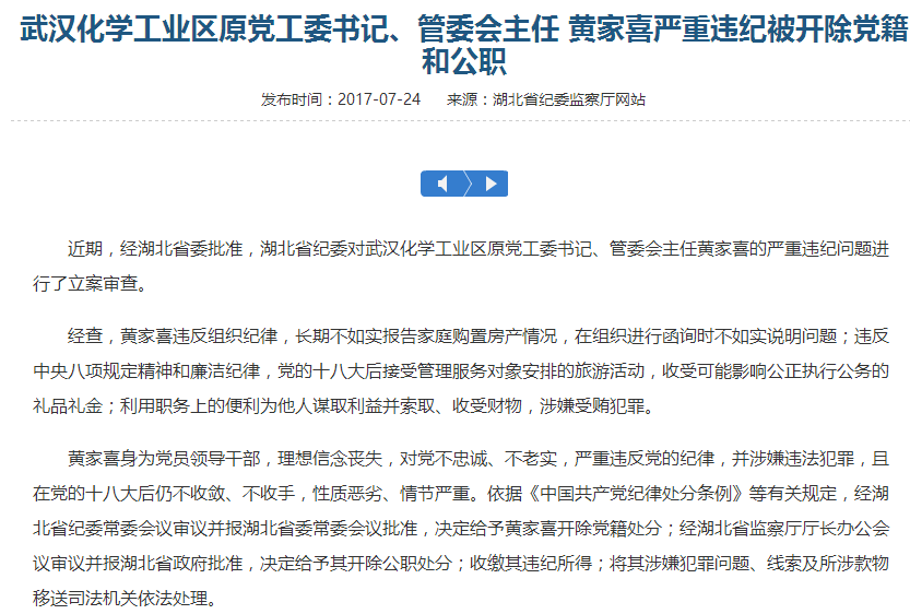 武漢化學(xué)工業(yè)區(qū)原黨工委書(shū)記、管委會(huì)主任黃家喜嚴(yán)重違紀(jì)被開(kāi)除黨籍和公職