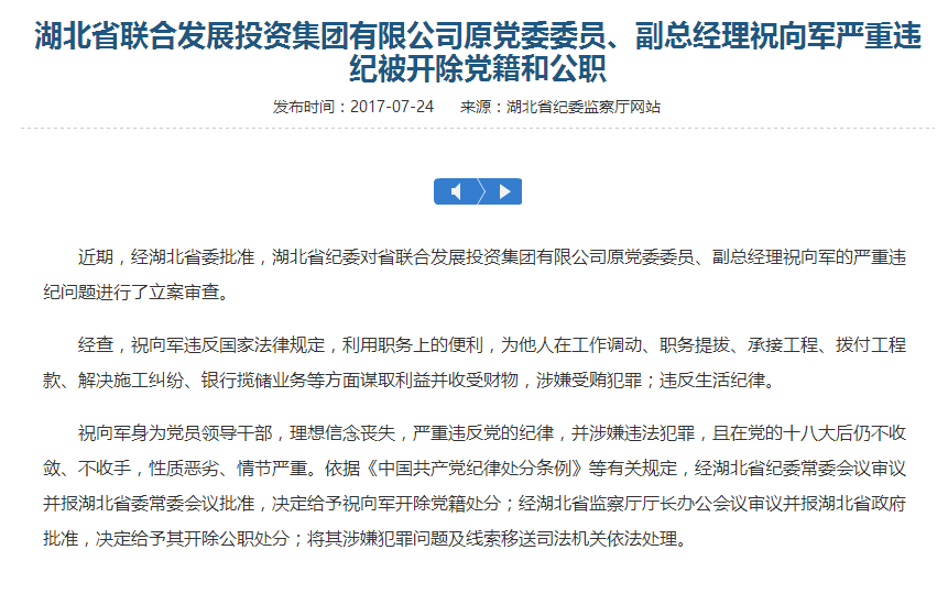湖北省聯(lián)合發(fā)展投資集團(tuán)有限公司原黨委委員、副總經(jīng)理祝向軍嚴(yán)重違紀(jì)被開(kāi)除黨籍和公職